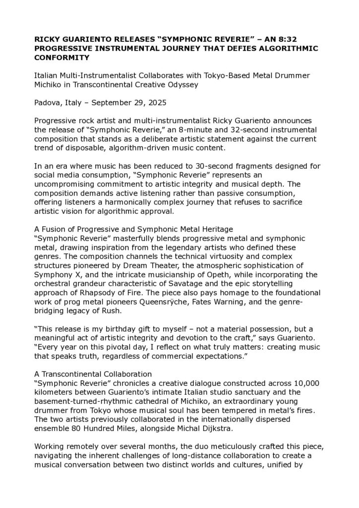 L’artista visivo e polistrumentista italiano Ricky Guariento ha raccontato a Philipp Gottfried di Metal-FM la storia dietro “Symphonic Reverie”, un viaggio sonoro di 8 minuti e 32 secondi che manda affanculo le regole dello streaming moderno. In questa intervista, Ricky svela il processo creativo, la collaborazione internazionale con la batterista giapponese Michiko, e quella filosofia di resistenza artistica che è l’anima del RickyVerso. Si parla di integrità creativa, del rifiuto totale degli algoritmi, e della passione viscerale per il Progressive Metal autentico.