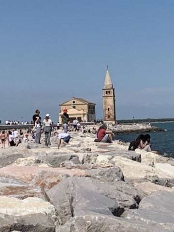 Passeggiando, mi sono fermato a osservare i dettagli che solo un occhio in cerca di bellezza può trattenere: la luce che si frantuma sull’acqua del lungomare, trasformandola in un tesoro liquido e dorato; il campanile cilindrico che veglia sul mare e sul tempo stesso; la Madonna dell’Angelo, protesa come una mano fin dentro l’acqua, custode di una leggenda che sa di miracolo e di sale; i Casoni dei pescatori, sentinelle di una tradizione che resiste, come vecchi saggi che non hanno fretta di andarsene. Qui ogni angolo diventa un verso già scritto. Ogni facciata colorata è un dipinto che si contempla in silenzio. Ogni passo, parte di un poema che non ha bisogno di rime per esistere.