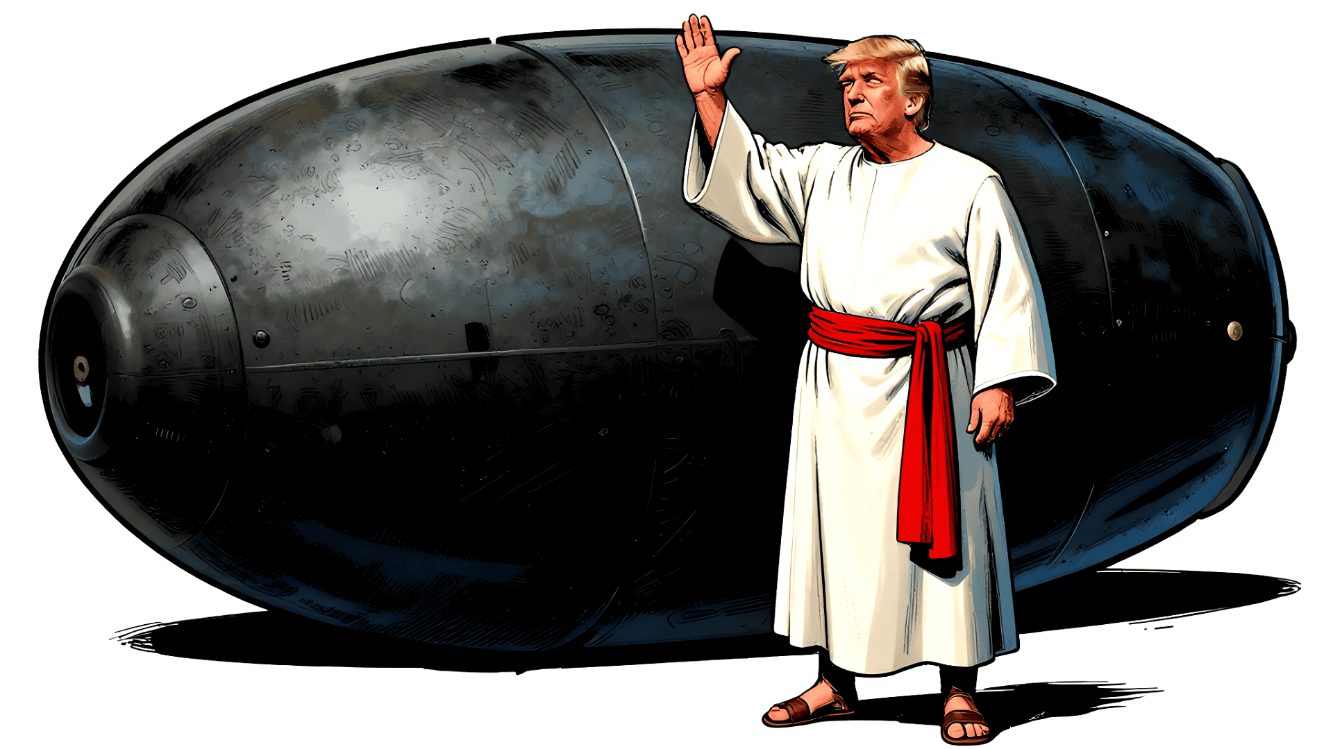 Illustrazione satirica dello scontro di Trump contro Papa Leone: il Presidente in tunica benedice una bomba atomica.